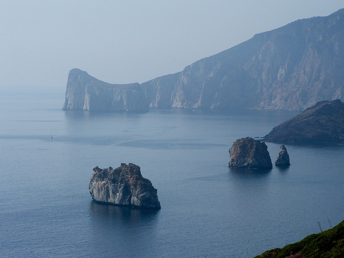 Il litorale presso i due paesini è formato da rocce metallifere dal particolare colore violaceo, in netto contrasto con il candore dei tre isolotti calcarei detti S’Agusteri (quello a nord e quello al centro) e Il Morto (quello meridionale, più grande), che emergono dal mare prospiciente. La veduta è chiusa poi dalle rupi del M. Nai, da cui in remote epoche geologiche si staccò lo splendido faraglione del Pan di Zucchero.
